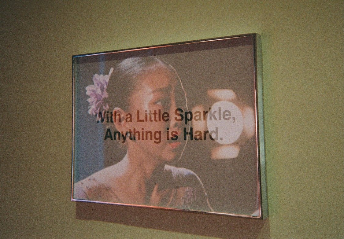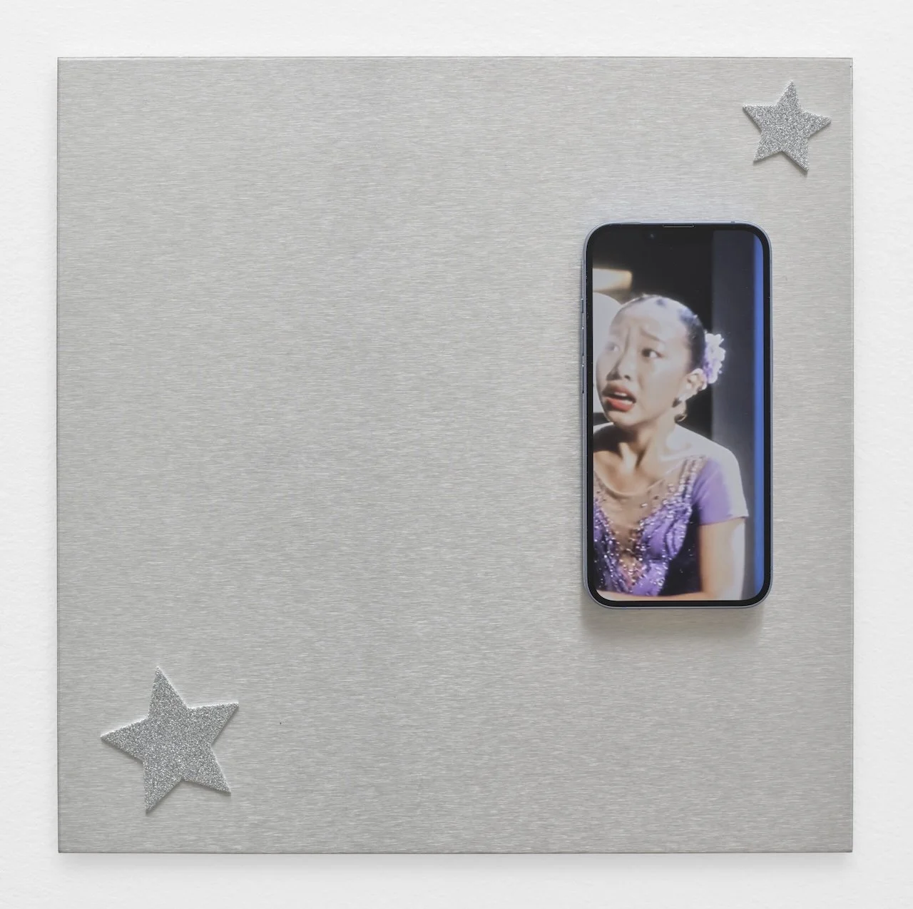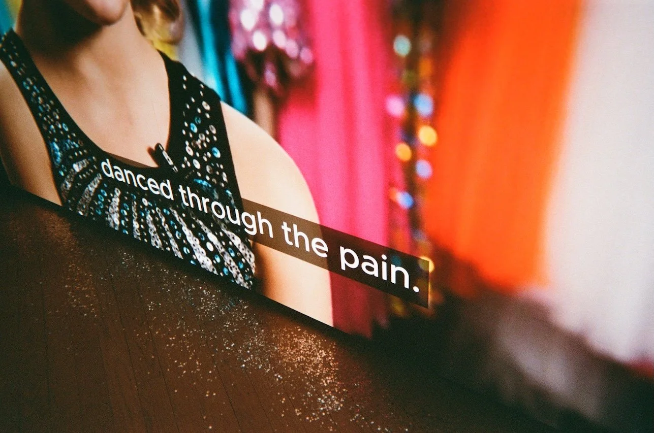 What distinguishes StarPower within Maya’s broader practice is its scale and commitment to worldbuilding. Rather than presenting discrete works, the exhibition constructs an entire ecosystem. A fictional dance company, Shimmer, emerges across the show, appearing in background signage, motivational slogans, and even costume elements like a warm-up jacket pinned with real competition badges that appears at the entrance of the gallery. In the first gallery room, “fan edits” of StarQuest clips play on mounted iPhones, mimicking the aesthetics of TikTok and YouTube remix culture. The installation requires visitors to lean in closer, creating a moment of intimate screen-time in crowds of craning necks. And while StarQuest dominates the main room, visitors pause at quilted screenprints and motivational posters peppered along the nearby walls.