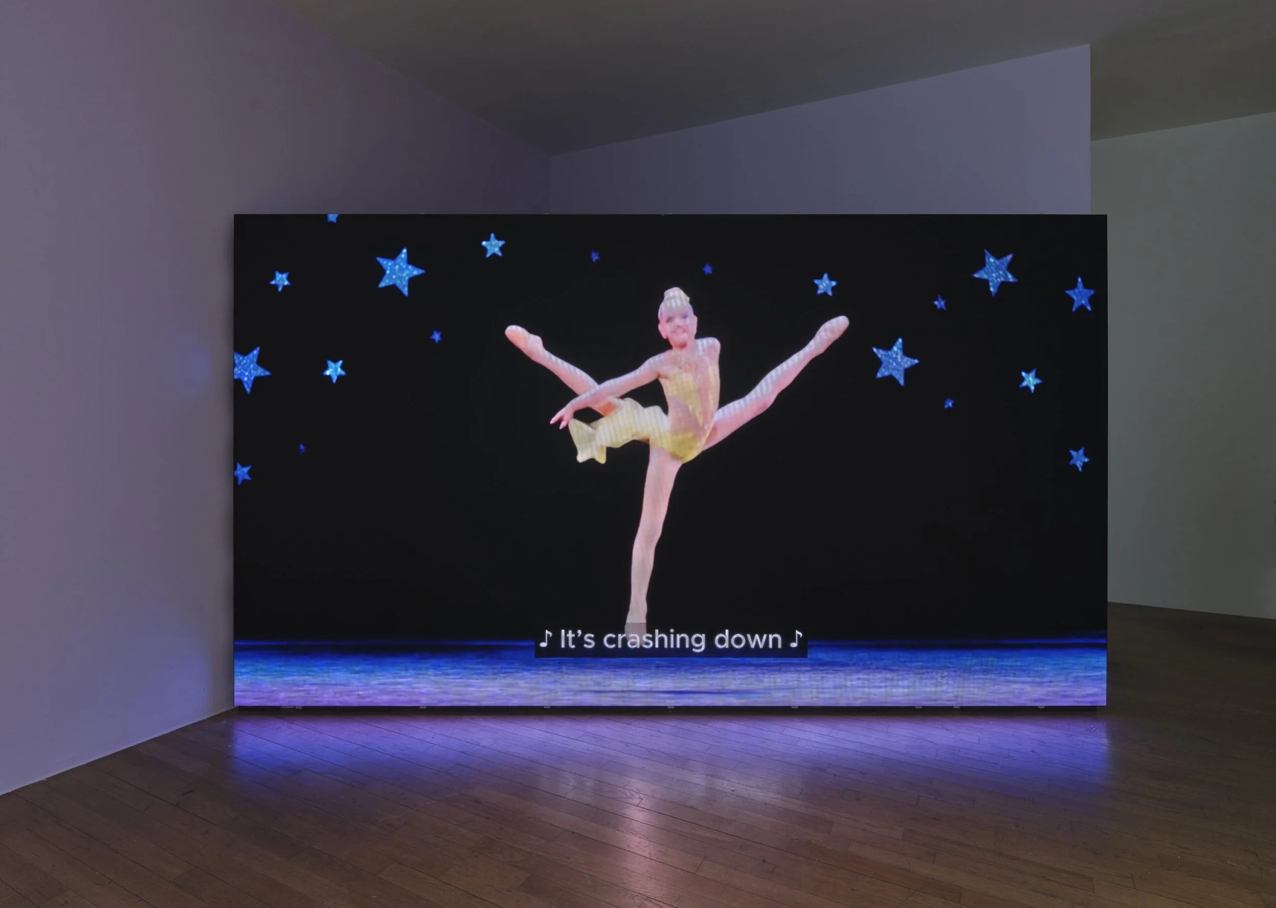 The exhibition’s central work, StarQuest, 2026, flickers through 111 AI-generated scenes of competitive dancers. Wearing lipgloss and mascara, the preteens look up at off-screen instructors and contort their bodies at absurd angles on a large projection in the main room of the gallery. Glitter covers the floor underneath, reflecting the uniforms’ aquamarine-fuschia fabric. The video sequences are brief, looping, and endlessly recombined, producing a non-linear choreography that never quite resolves. Occasionally, the dancers pause to deliver confessional monologues that echo the cadence of reality television. The aesthetic evokes mid-2010s TLC reality shows, but the dancer’s facial expressions are distant and off-beat.